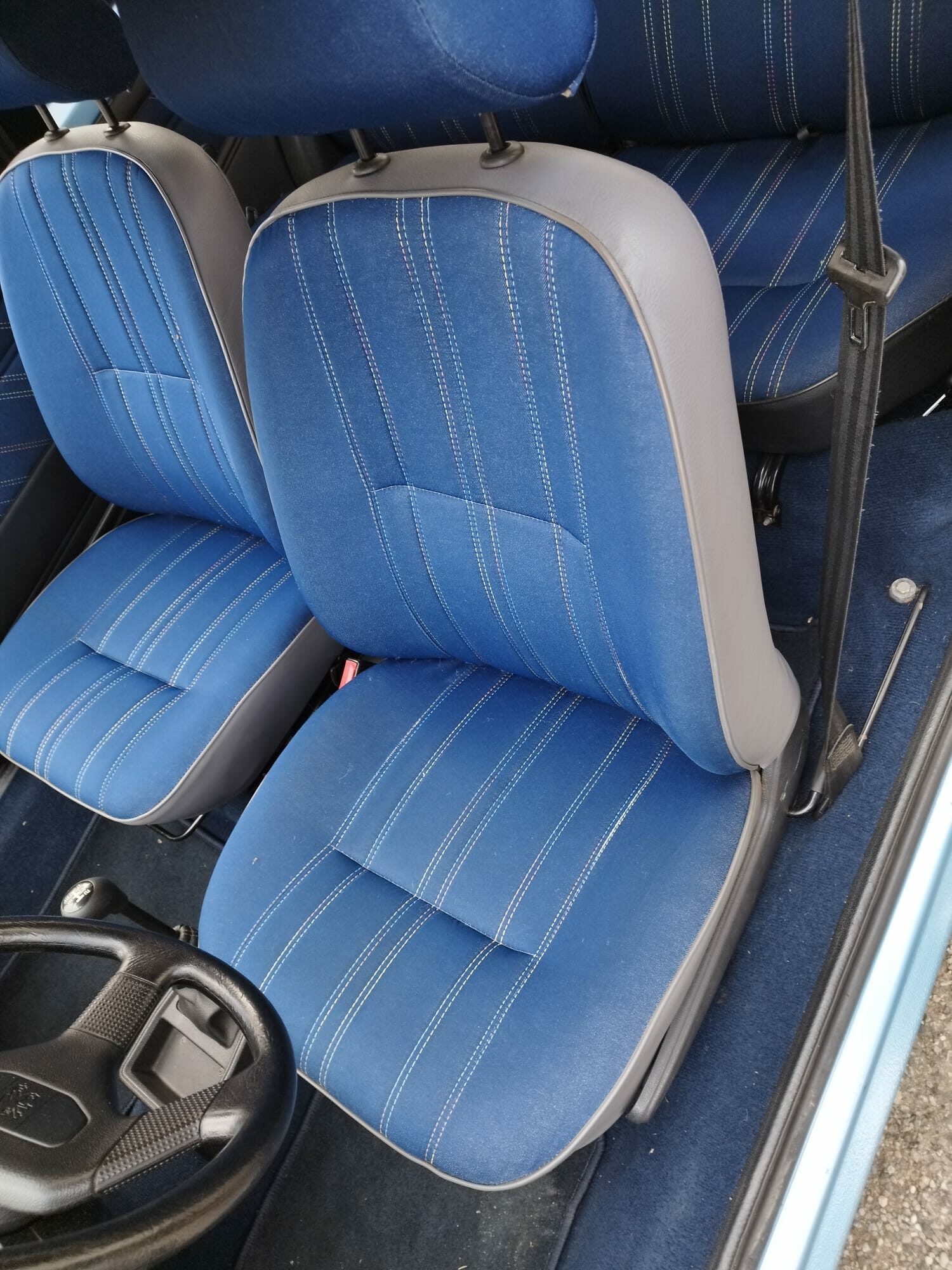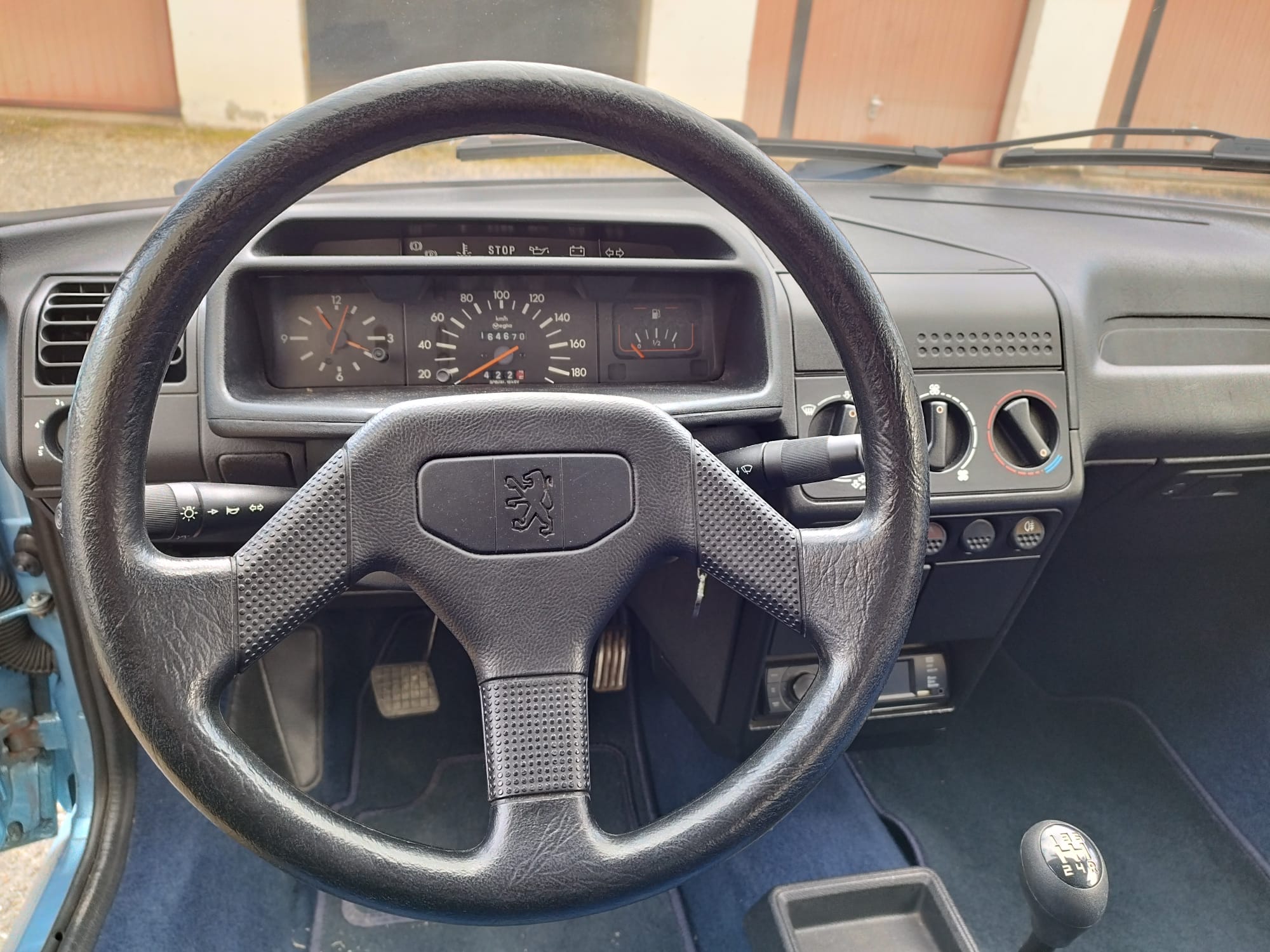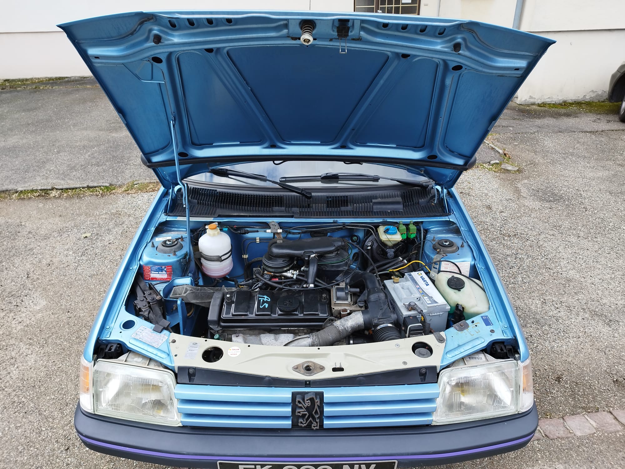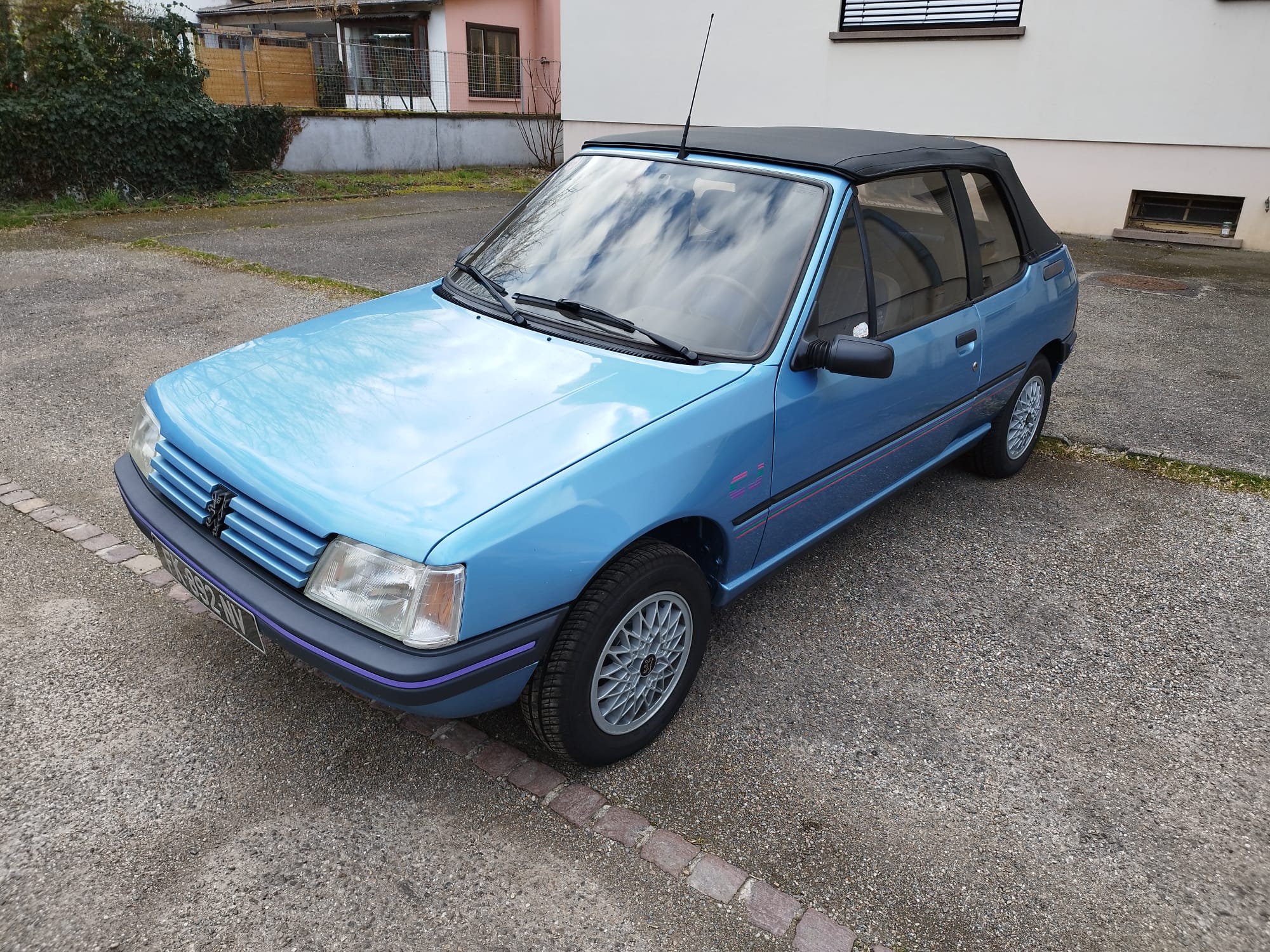 Peugeot 205 CJ, couleur bleu azzuro. L’état est impressionnant pour les 31 ans de la voiture.
