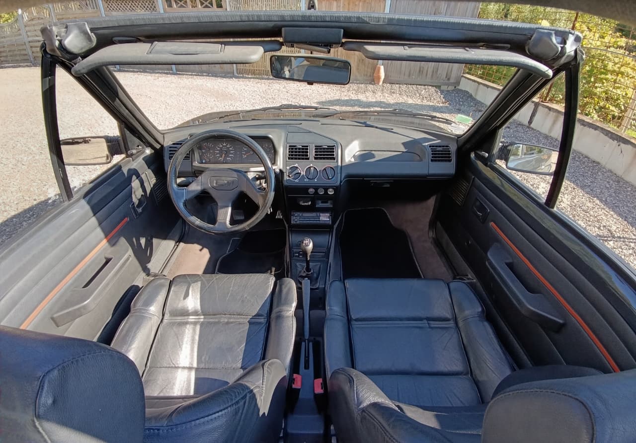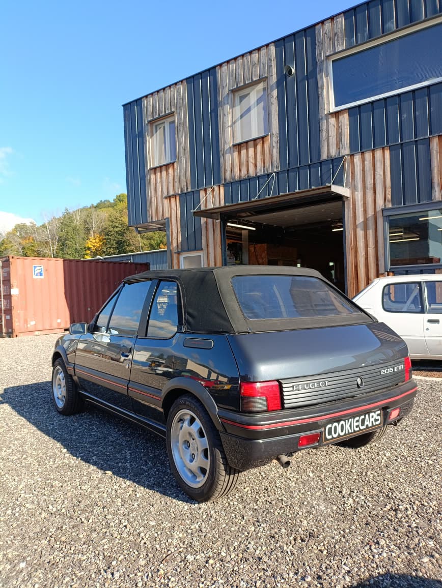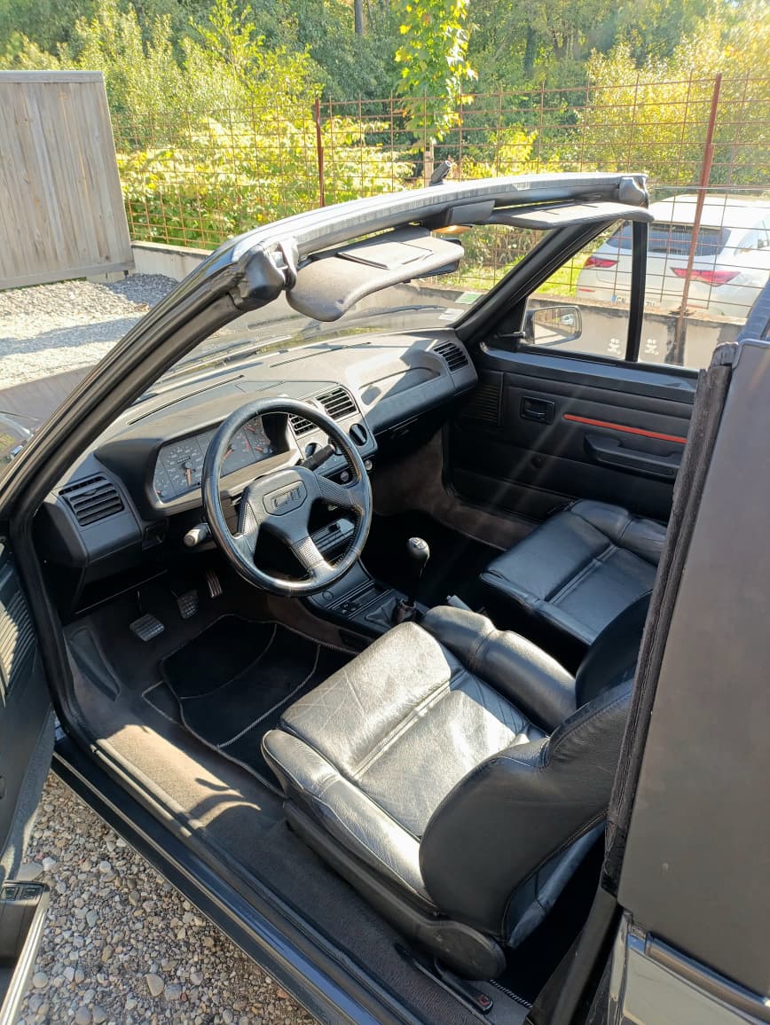Sellerie cuir noir impeccable. Capote électrique fonctionnelle et en bon état. Jantes 205 GTI 1.9